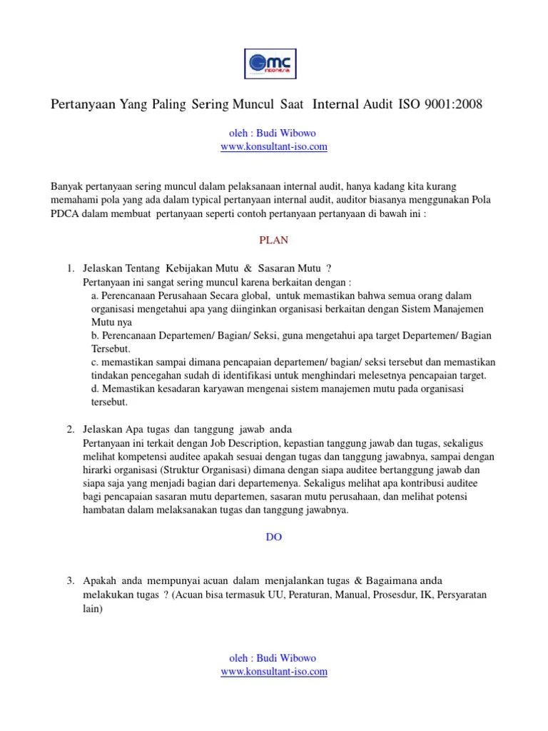 118 tabel 1 daftar pertanyaan efektivitas audit internal pertanyaan no indepedensi auditor internal y n/r t 1 apakah auditor internal yang ada pada perusahaan merupakan fungsi yang Hal ini merupakan tanggung jawab manajemen sebagai garis pertahanan pertama (first line of defense). Sas 99 mewajibkan tim audit mengadakan diskusi untuk berbagai wawasan diantara anggota tim audit yang lebih berpengalaman serta berbagi pendapat. Dec 11, 2015 · komunikasi diantara tim audit. Hal yang ditanyakan auditor meliputi :